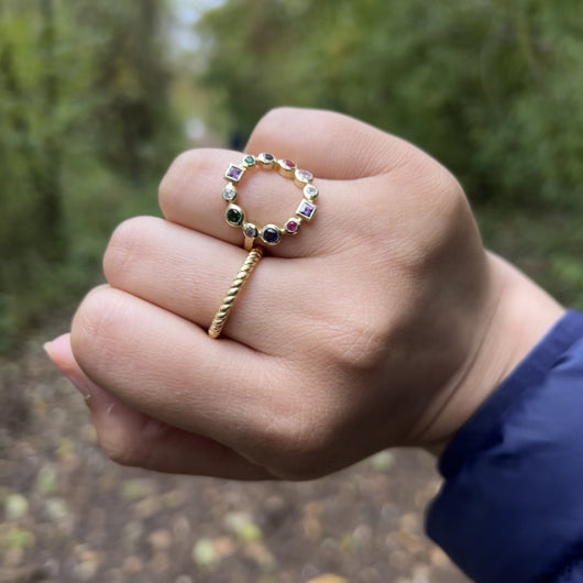 Add a touch of vibrant elegance to your style with this stunning multi-gemstone ring. Designed in a dazzling circular formation, it features an array of sparkling gemstones in a rainbow of colors that catch the light beautifully. Each stone is carefully set to create a harmonious blend of color, making it the perfect statement piece for any occasion. Crafted with an adjustable band, this ring provides a comfortable, custom fit for any finger, combining luxury with everyday convenience. Bold yet versatile, it’s a must-have for anyone who loves unique, eye-catching jewelry.