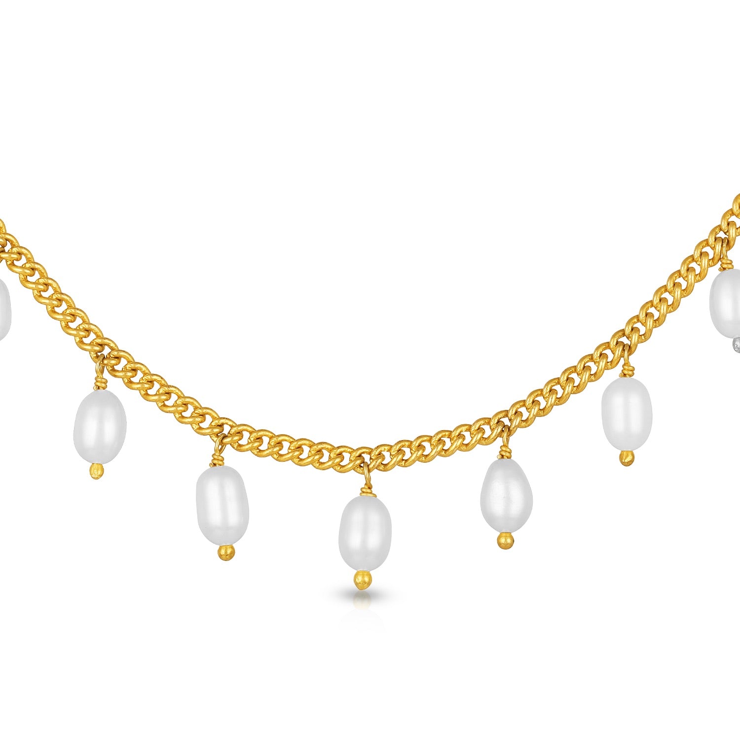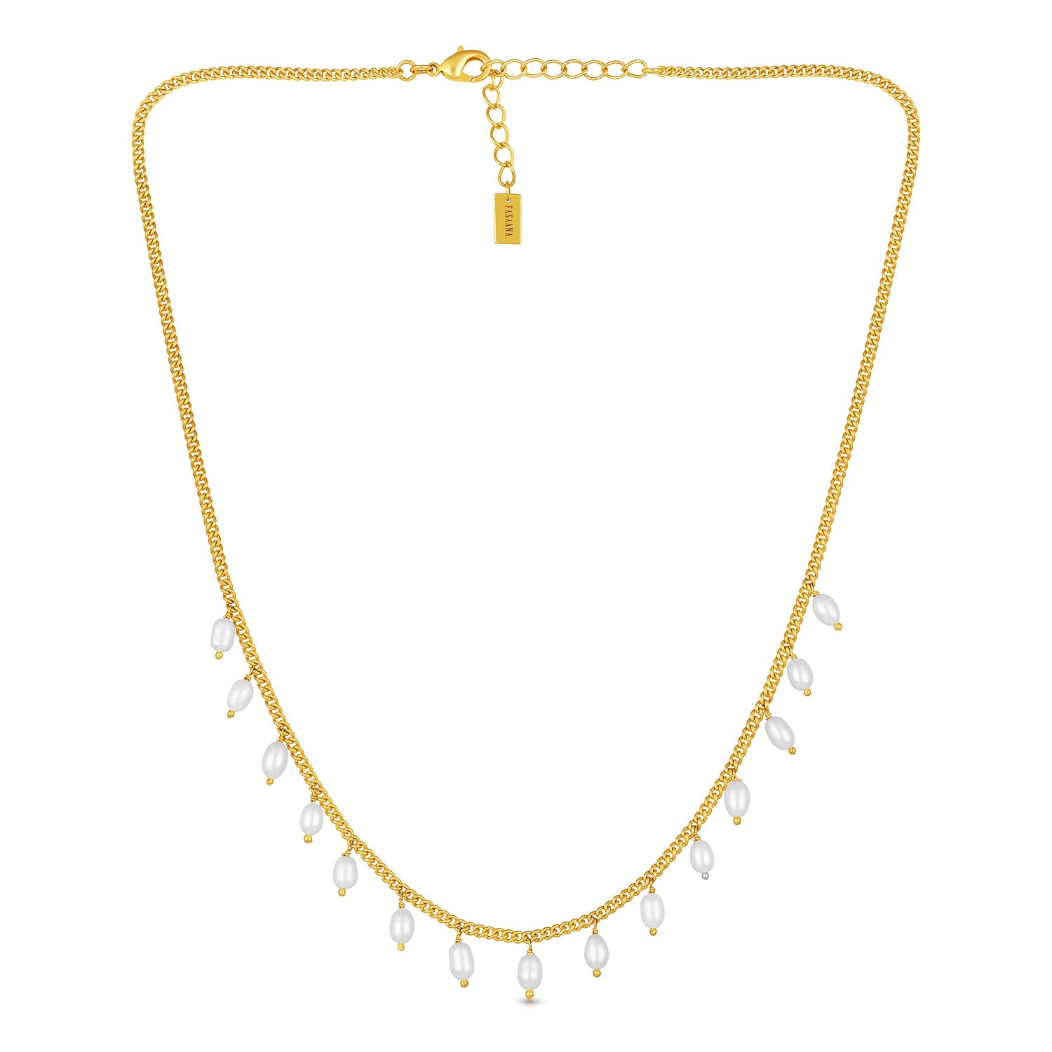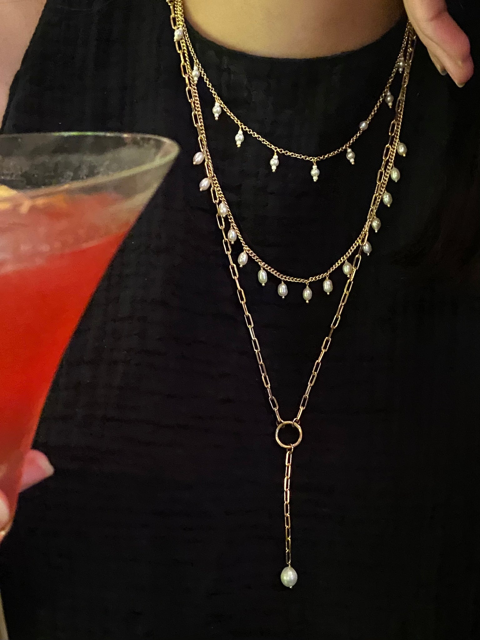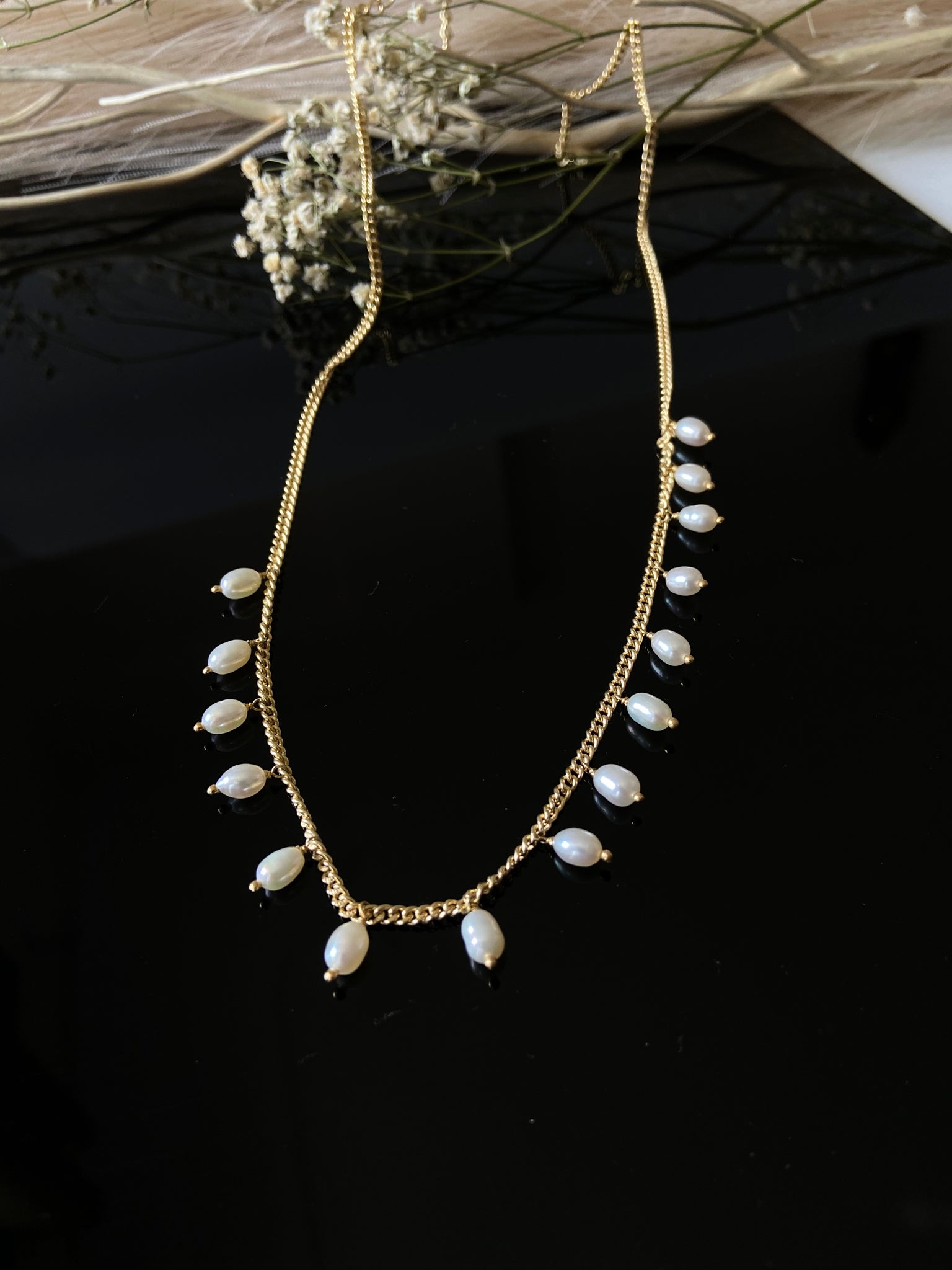 Crafted with freshwater pearls and threaded on an adjustable gold chain. The chain is 17” long with pearls strung up close together, with a built-in adjuster chain, which allows you to wear it at exactly the right length for you, pair it with our other pearl necklaces to create a stack.